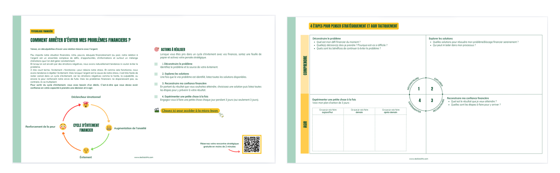 Le Template ci-dessous est le document que j'utilise lorsqu'un sujet financier me donne envie de fuir. Il m'aide à clarifier la situation pour identifier les solutions puis à passer à l'action plus sereinement en planifiant 3 petites actions.